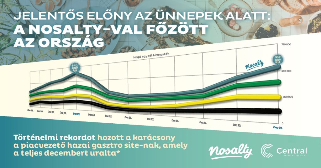 „A decemberi forgalmi adatok ismét megerősítették a Nosalty piacvezető szerepét. Az ünnepi időszak csúcspontján, december 23–24-én nemcsak a receptoldalak, hanem a hírportálok mezőnyében is az élre kerültünk, december 23-a pedig a Nosalty történetének eddigi legnagyobb napi forgalmát hozta. Ez a stabil és széles elérés teszi a Nosaltyt megbízható és vonzó partnerévé minden hirdető számára” – árulta el Kovács Ádám, a Nosalty Head of Digital Brand munkatársa utalva a 2025. december 23. napi